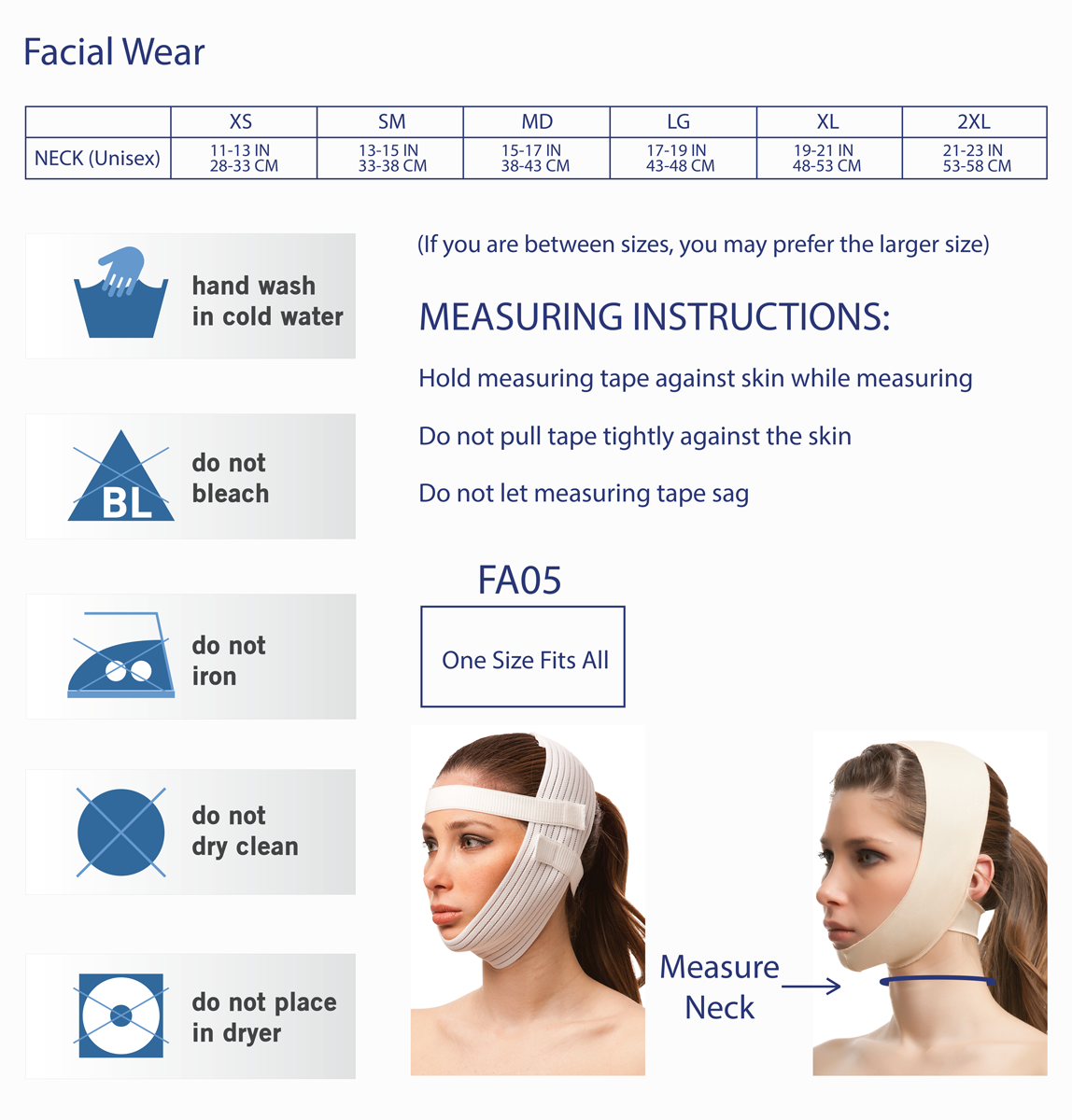 Our facial wrap is designed with a non-slip dome with a Velcro closure on top of the head. 2 adjustable bands to keep the garment stable.