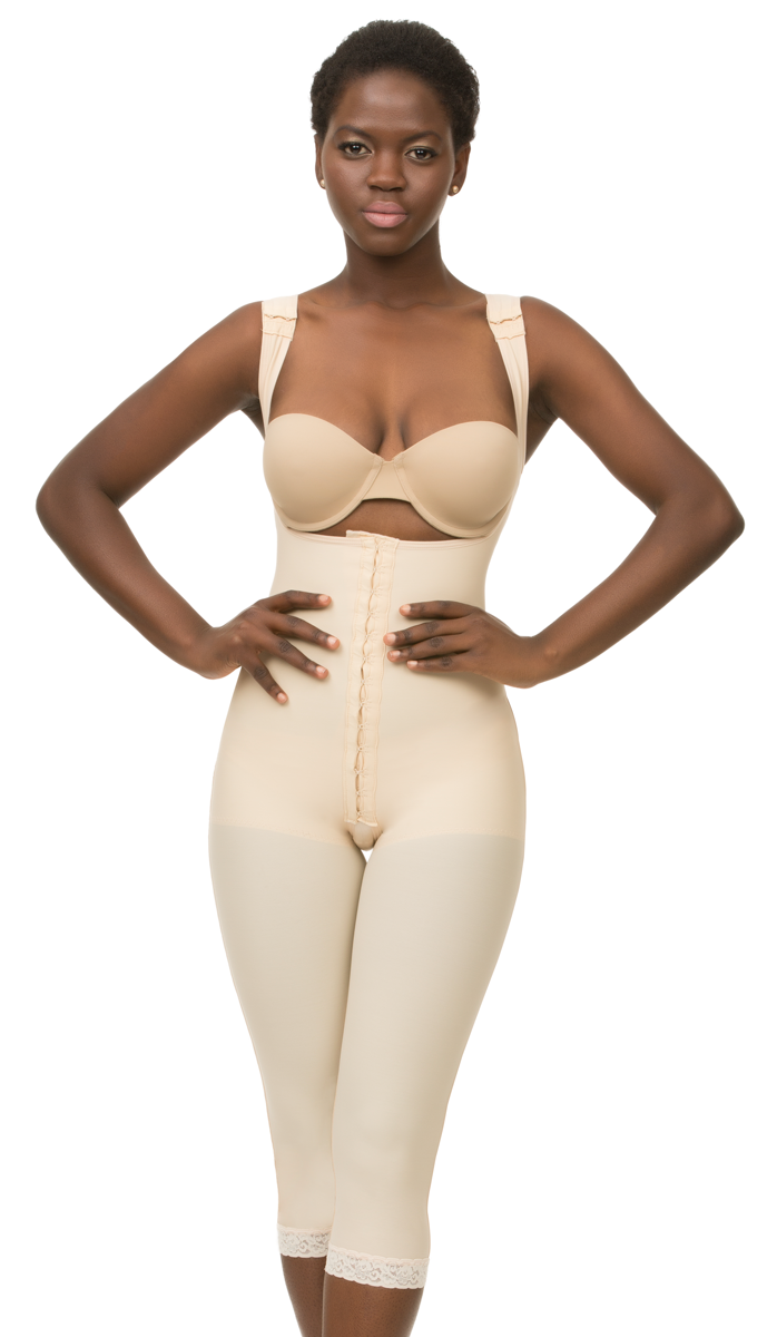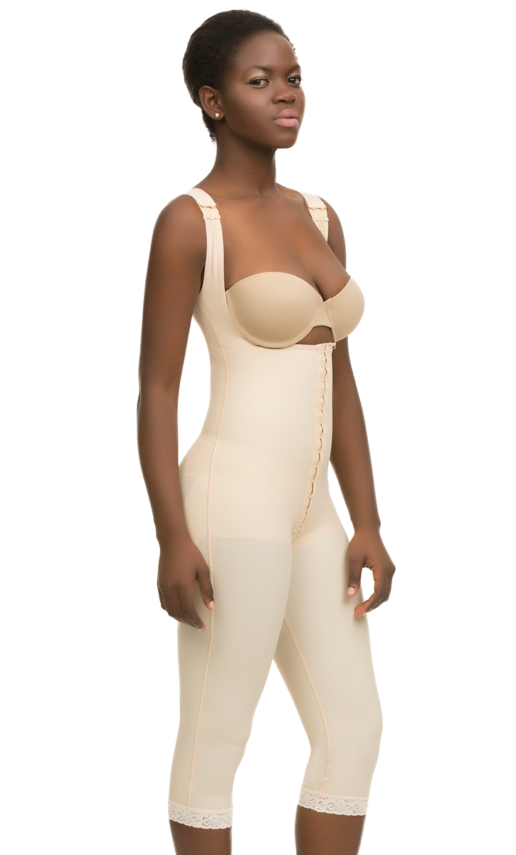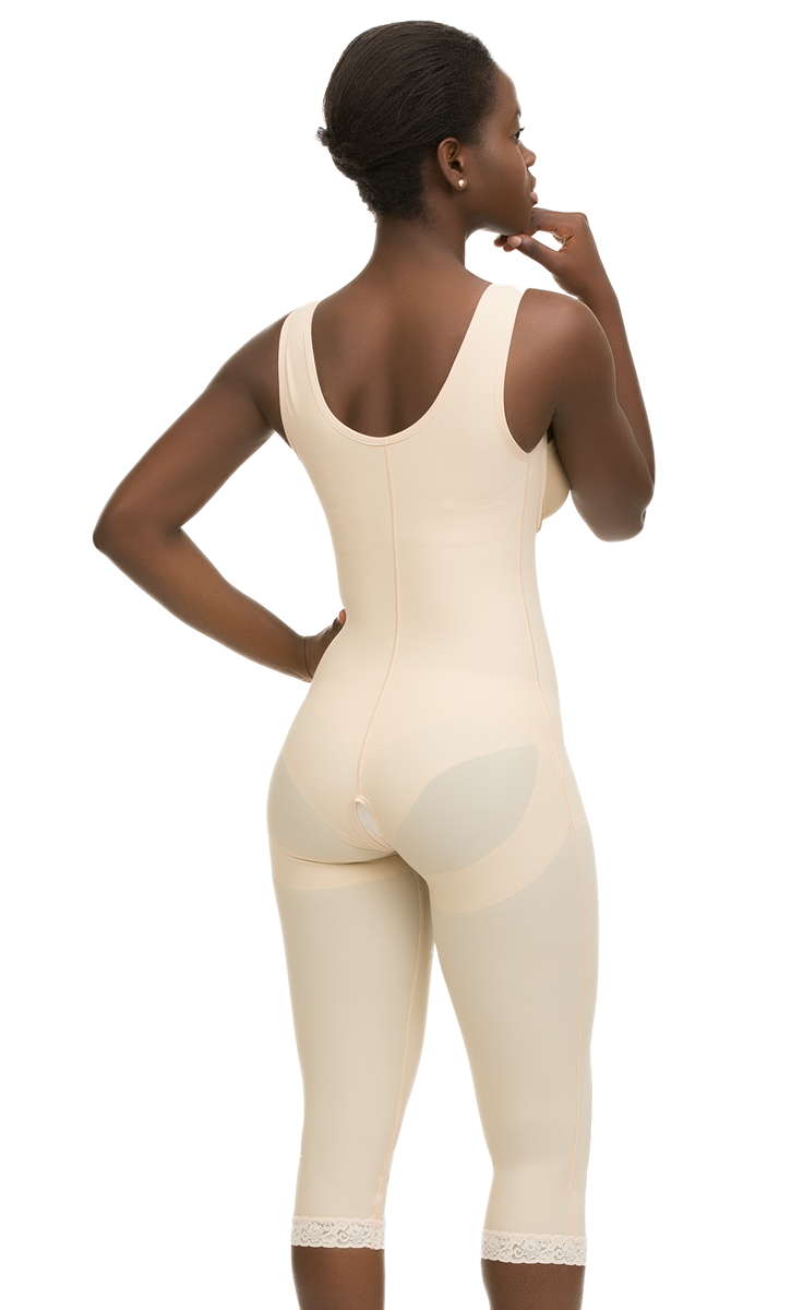 Features: Designed Adjustable 3 row hook & eye front center and shoulder straps, Below the Knee length, High back open crotch. Features a pretty lace detail at the base of each leg piece. We designed an extra panel of a Nylon/Spandex blend on the tush creating a smooth seamless look under clothing. A high-compression latex middle layer with Naturexx which provides breathable and flexible slimming of the tummy. A creative solution for those who want the illusion of slim and trim thighs, a tummy-tuck and a butt-lift without the use of padding. Prevents the accumulation irregularities in the crotch and hip area. The accumulation in the hips disappears or is repositioned to the buttocks. Provides perfectly shaped buttocks. Recommended use during the first 1-2 weeks post surgery.
