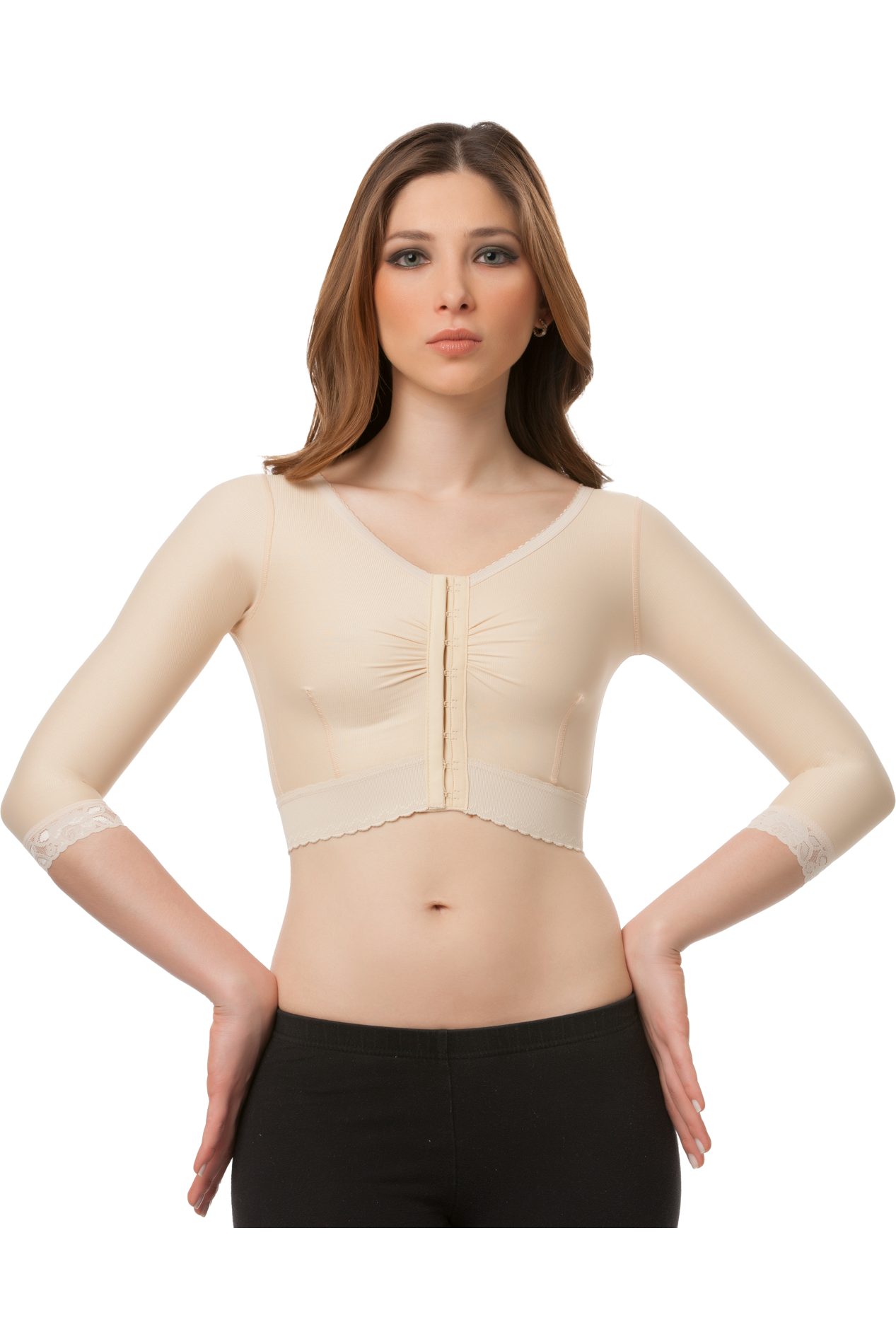 Features: The vest and bra combination has hook and eye closure in front with a 3" elastic band. Sleeves slightly below elbow. Available in three different sleeve lengths. This vest and bra combination is designed to provide compression in the upper torso and arms. They enhance the recovery of an arm lift, liposuction, breast surgery. Surgical Bras are a vital component in the recovery from a breast implants, breast reduction, breast reconstruction, mastectomies, or any other breast augmentation. Know the difference between a Surgical Bra and Retail Bras! When used correctly, surgical compression bras will reduce swelling, protect, and stabilize the breast area during the surgery recovery period.